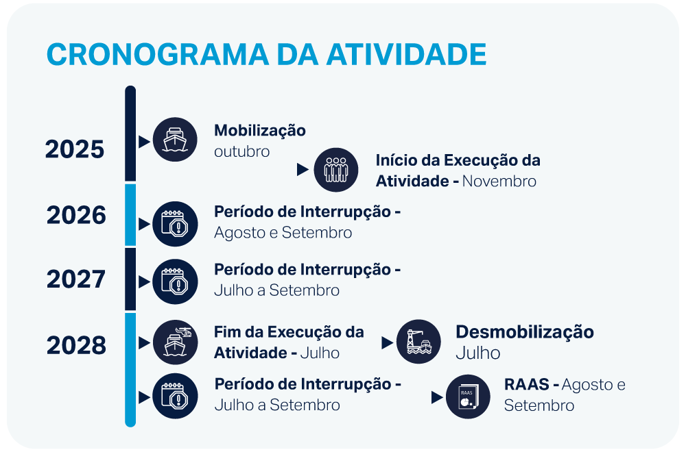 A TGS implementará períodos de silêncio em sua operação visando mitigar impactos sobre a fauna marinha sensível, especialmente aves e cetáceos, durante a temporada de maior ocorrência dessas espécies.