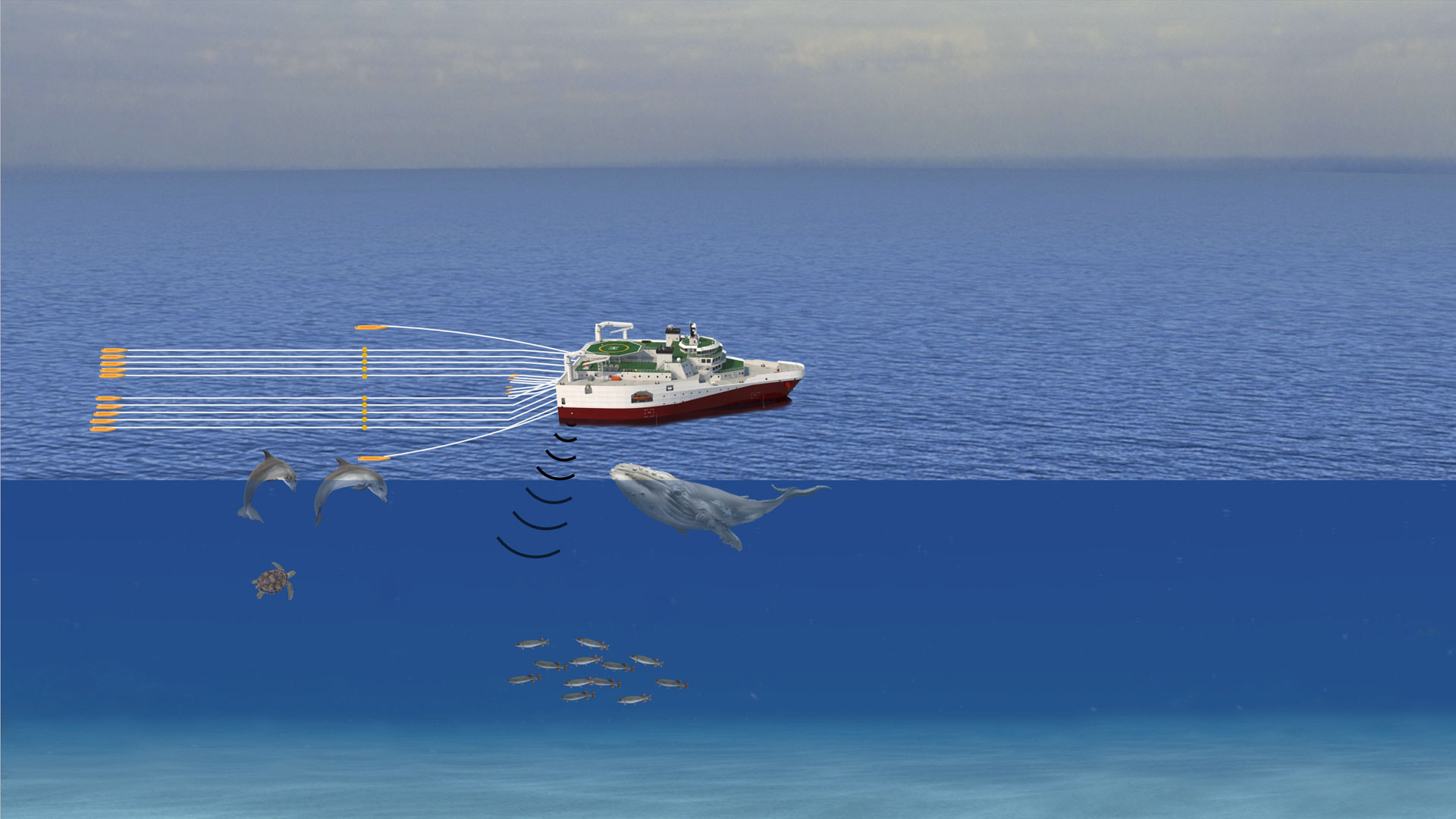 - Monitoramento visual e acústico a bordo da embarcação sísmica;